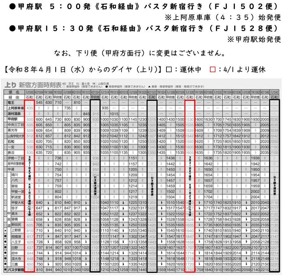 高速バス「甲府~新宿線」につきましては、令和8年4月1日(水)より一部ダイヤ(富士急バス便)を運休とさせていただきます。